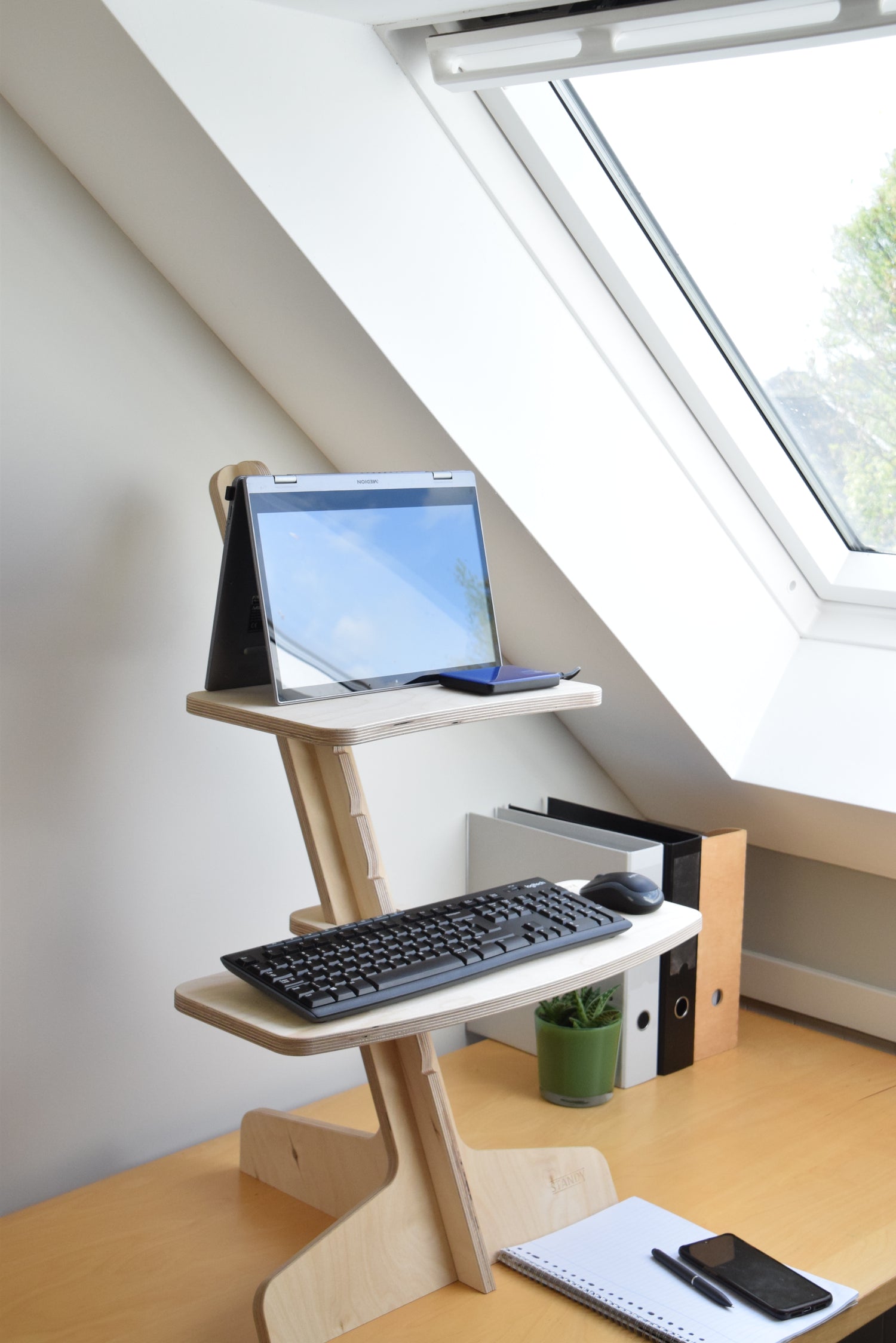 It’s lightweight and modular, which means you can bring it anywhere and with the special bag you can take it from your home office to a shared workspace or even a café. Despite its simplicity, it’s incredibly sturdy and reliable, made from solid birch plywood that holds your laptop or screen at the ideal height. This makes it even healtier than a expensive leveling desk.